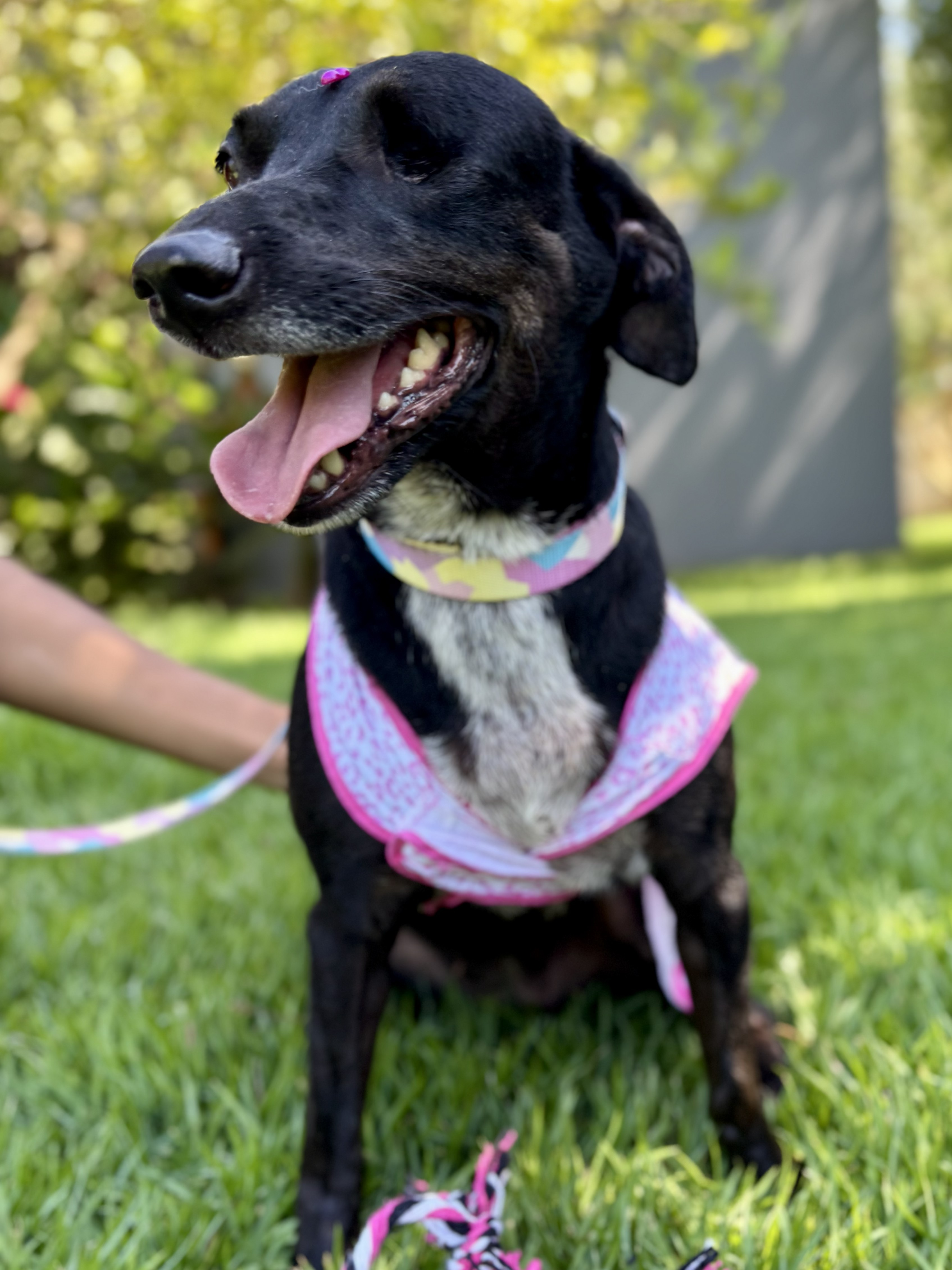 É uma cadelinha dócil, brincalhona e se dá bem com outros animais.